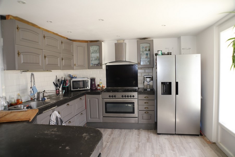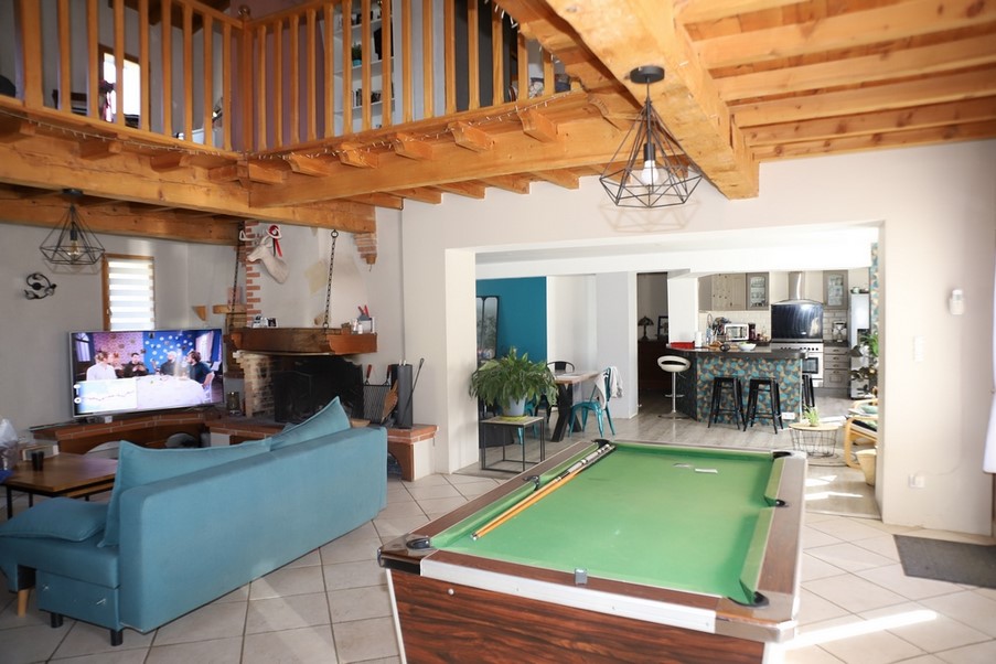 Maison de 295m², 4 chambres, 3 salles de bains, bureau, spacieux séjour avec cheminée, cuisine équipée, garage.